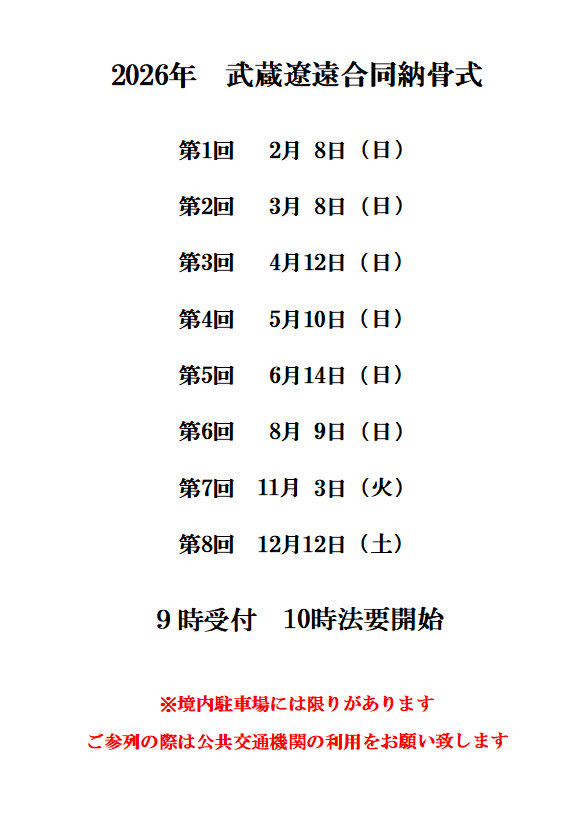下記の日程で納骨式を執り行います。※事前に永代供養の契約が必要です。午前中は駐車場の満車が予想されます。通常のご参拝の方はお時間をずらしてお参りください。ご不便をおかけしますがご理解とご協力をお願い申し上げます。